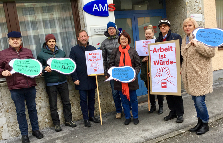 Unter dem Titel ‚Arbeit ist Würde‘ organisierte die SPÖ heute Vormittag (Freitag, 26. Jänner 2018) bundesweit vor Geschäftsstellen des Arbeitsmarktservice (AMS) Kundgebungen, um auf die angekündigten bzw. bereits umgesetzten unsozialen Maßnahmen der schwarz-blauen Regierung aufmerksam zu machen. Als Aktion 20.000 Modell-Region stand im Pongau vor allem der Stopp des Reintegrierungsprogrammes in den Arbeitsmarkt für Über-50-Jährige im Fokus.