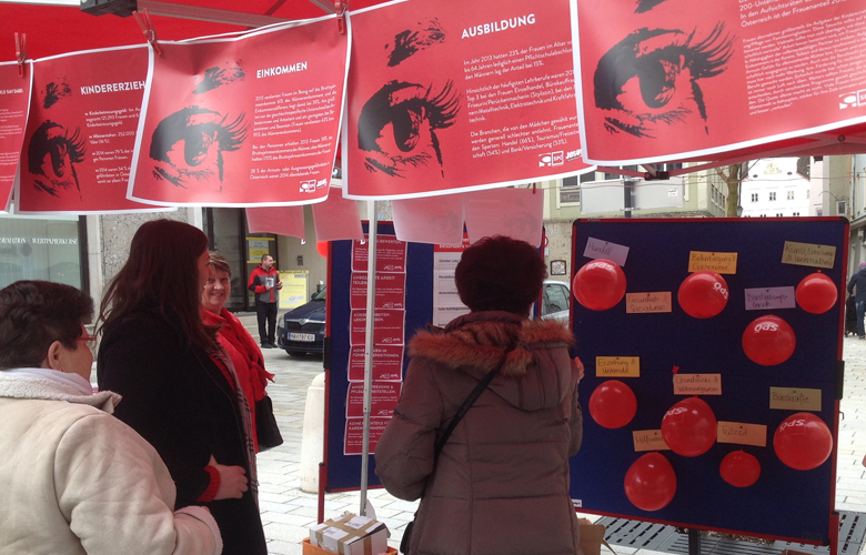 Bereits zum 105. Mal findet morgen der internationale Weltfrauentag statt. Für die SPÖ-Frauen-Tennengau, JUSOS -Tennengau und den ÖGB-Frauen ein Anlass, um auf eine der größten Ungerechtigkeiten in Österreich hinzuweisen: Den Einkommensunterschied zwischen Männern und Frauen. „Auch im Jahr 2016 ist es immer noch nicht gelungen, die Einkommensschere zwischen Männern und Frauen zu schließen. Für uns ein untragbarer Zustand, weshalb wir das Thema bei unserer Weltfrauentags-Aktion vergangenen Samstag in Hallein aufgegriffen haben“, berichtet die Tennengauer SPÖ-Bezirksfrauenvorsitzende, Landtagsvizepräsidentin Gudrun Mosler-Törnström.