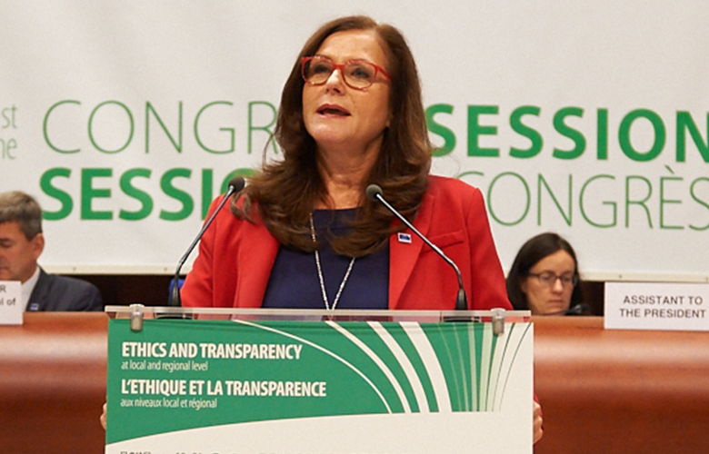 Bild oben | Gudrun Mosler-Törnström bei ihrer Rede zur Kandidatur im Kongress (Foto:CoE).