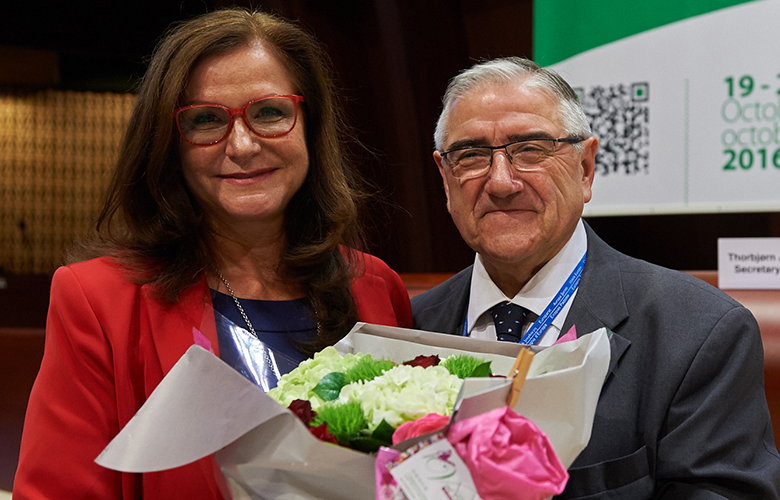 Bild unten | Glückwünsche an die neue Präsidentin Gudrun Mosler-Törnström von Jean-Claude Frecon (Kongresspräsident von 2014-2016)(Foto:CoE).